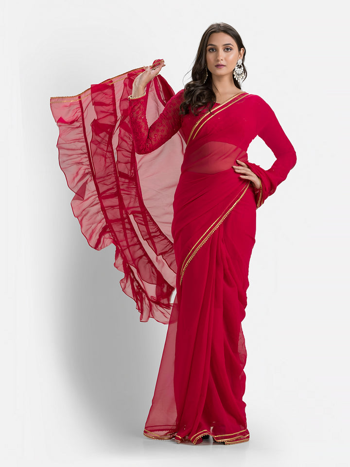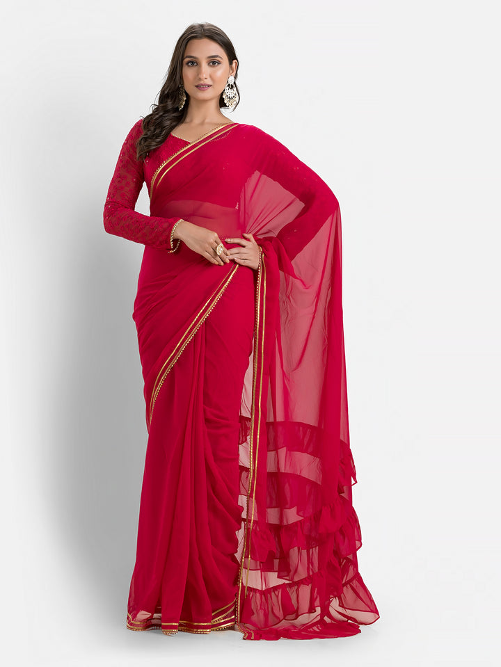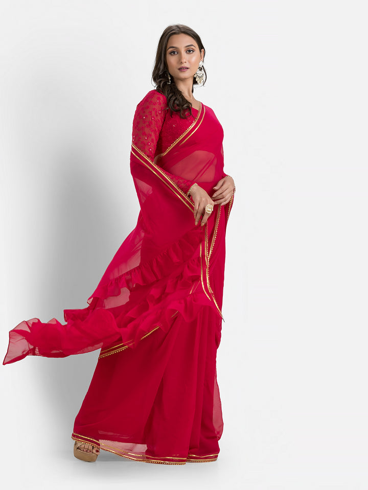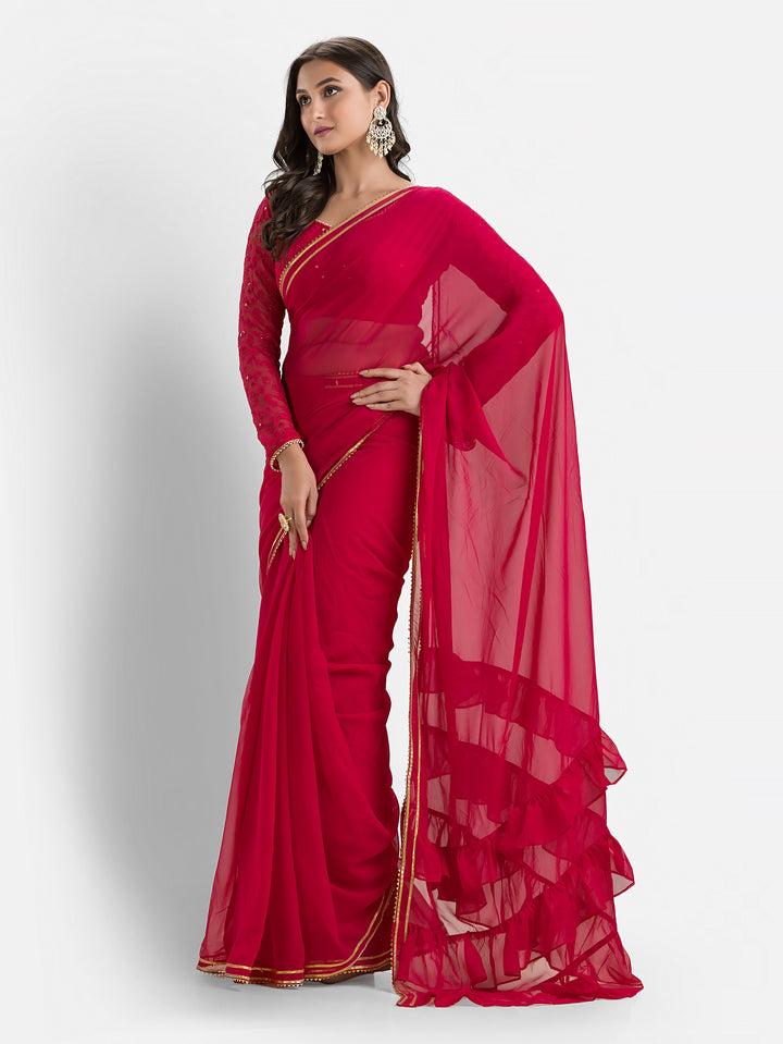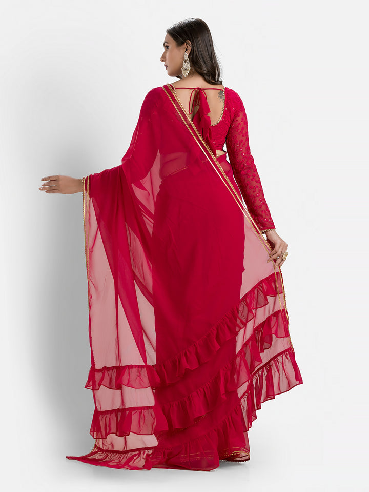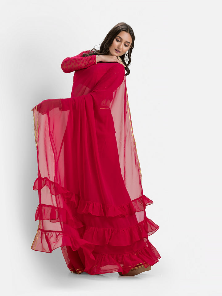 Candy Red Ruffle Pre-draped Saree with Blouse & Petticoat – Indievastra