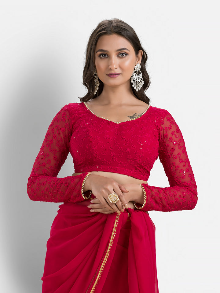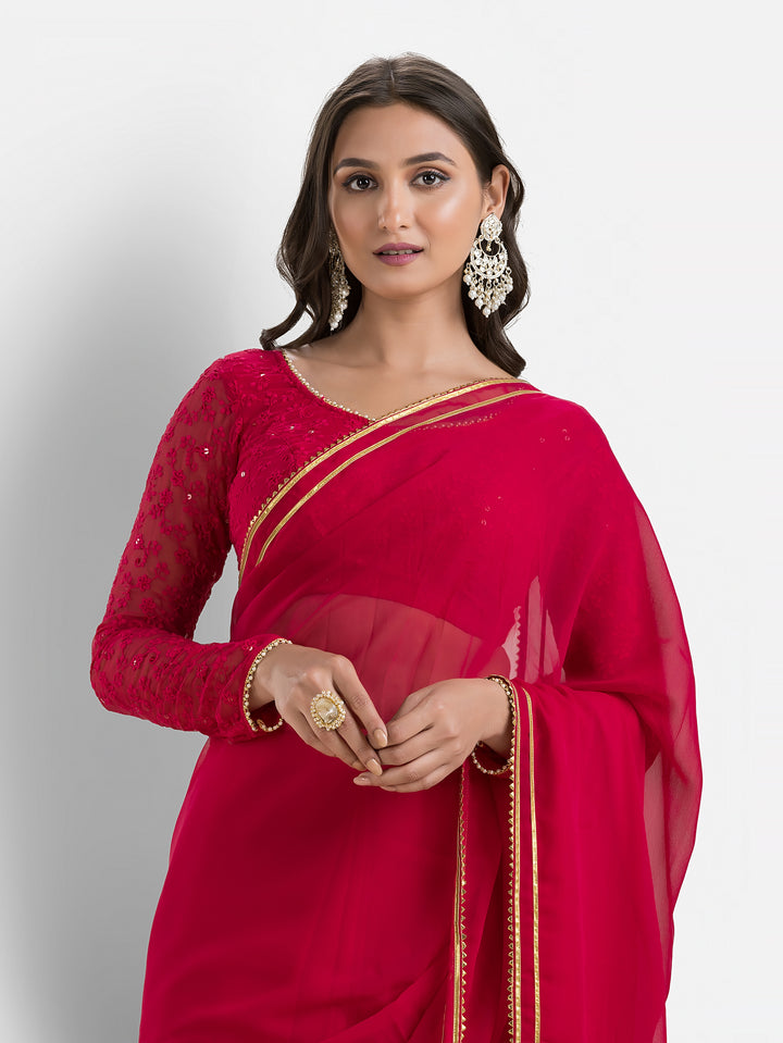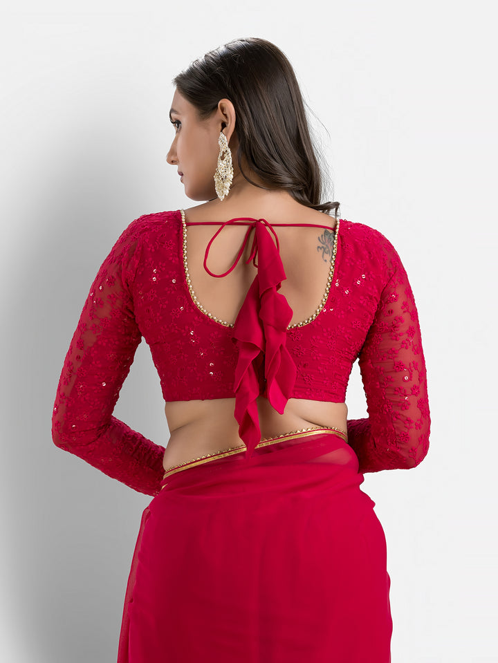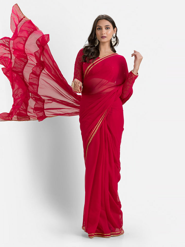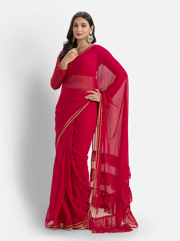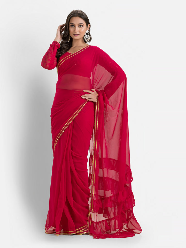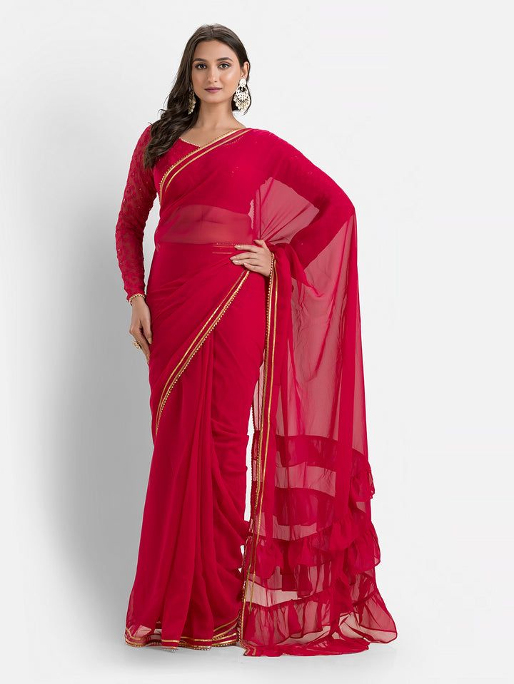 Candy Red Ruffle Pre-draped Saree with Blouse & Petticoat – Indievastra