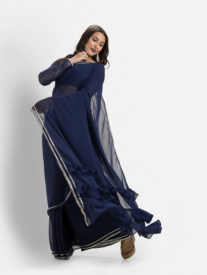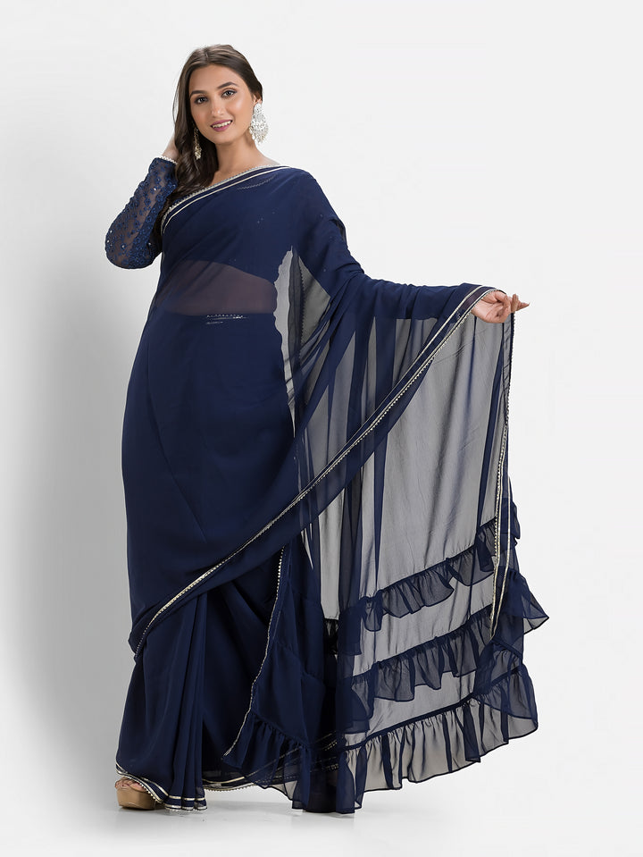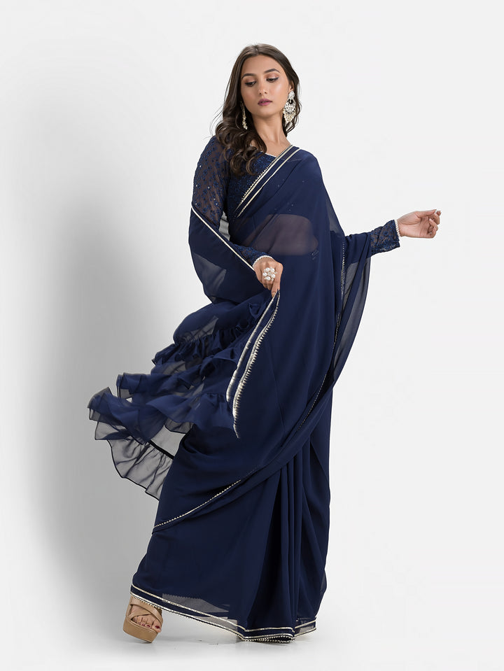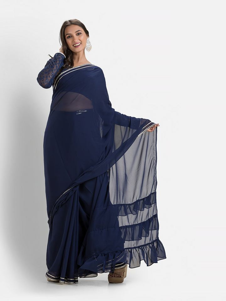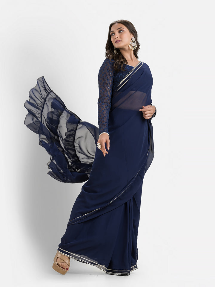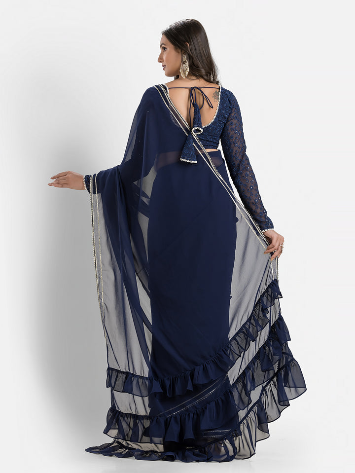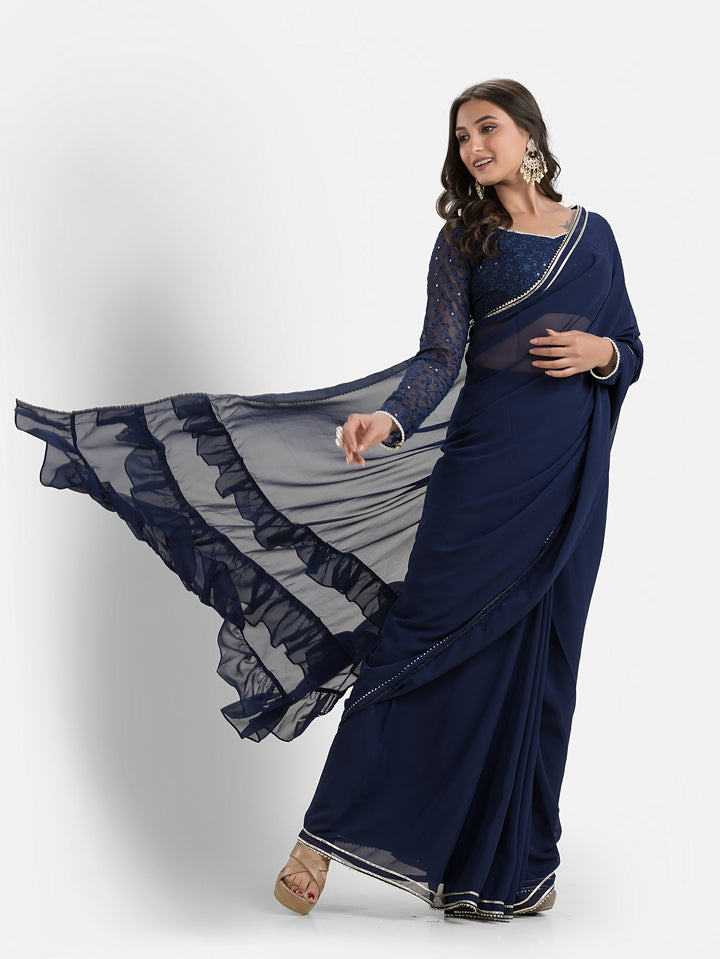 Diamond Blue Ruffle Pre-draped Saree with Blouse & Petticoat – Indievastra
