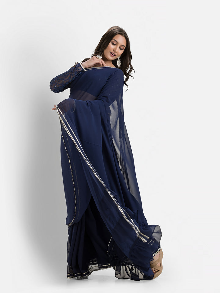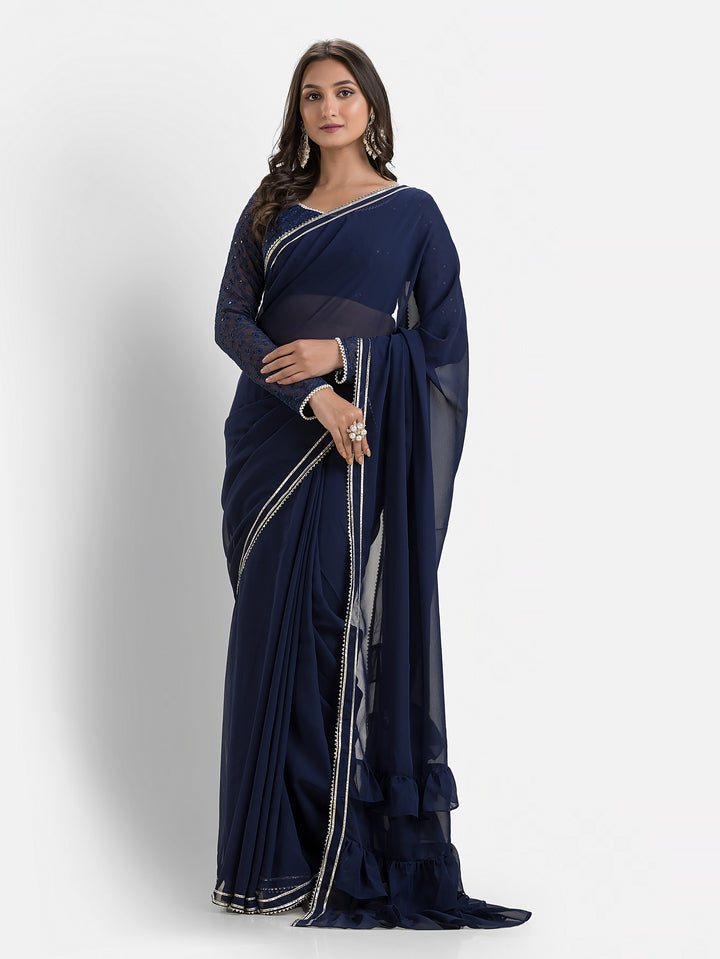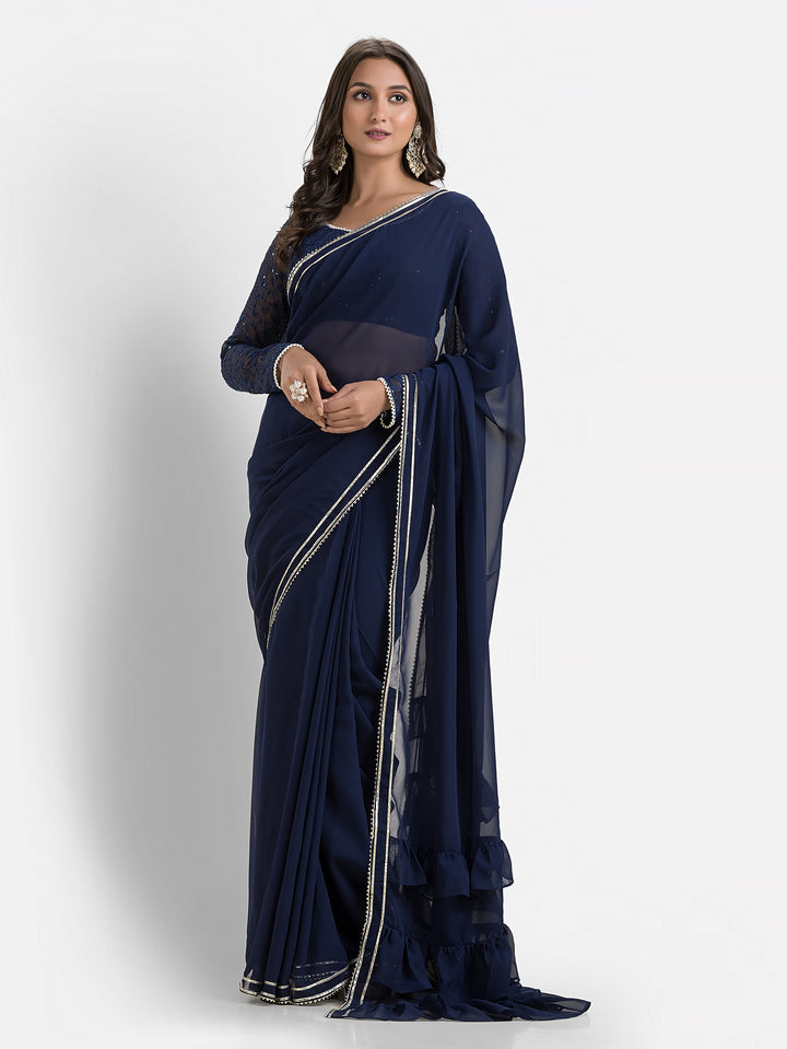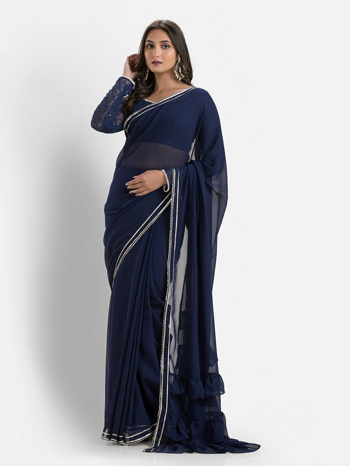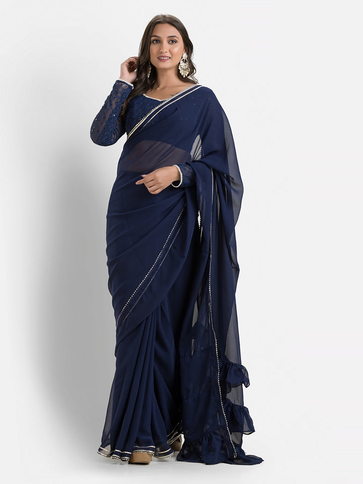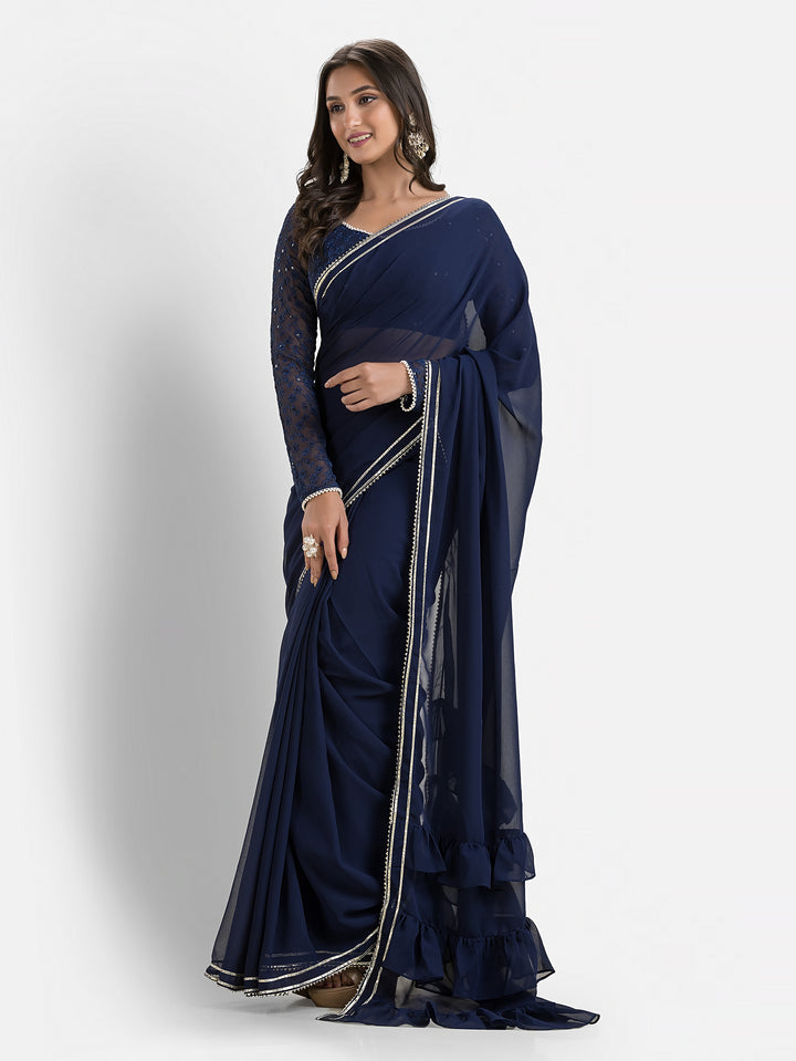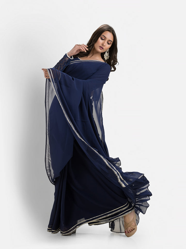 Diamond Blue Ruffle Pre-draped Saree with Blouse & Petticoat – Indievastra