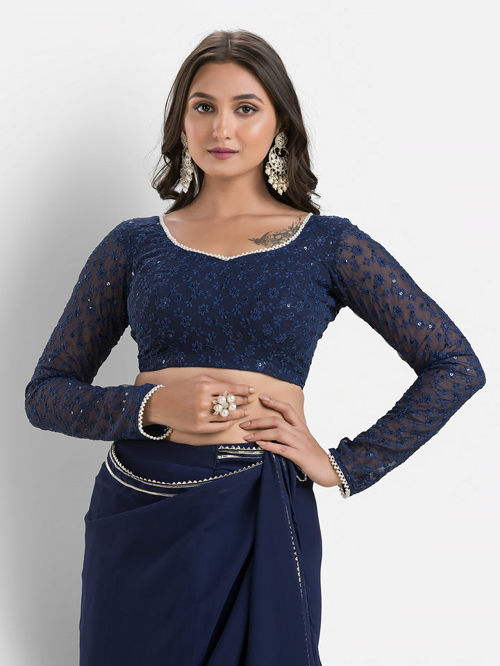The pre-draped silhouette ensures effortless styling, while the tailored blouse adds a chic edge to the look. Completed with a coordinated petticoat, this outfit is ideal for weddings, festive evenings, and cocktail parties where elegance meets glamour.