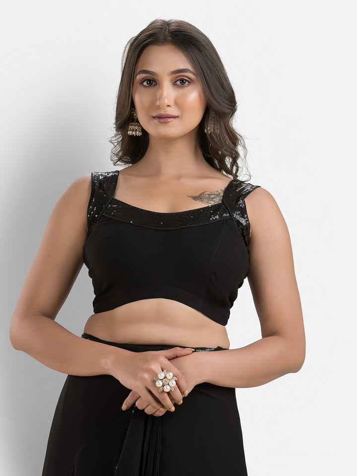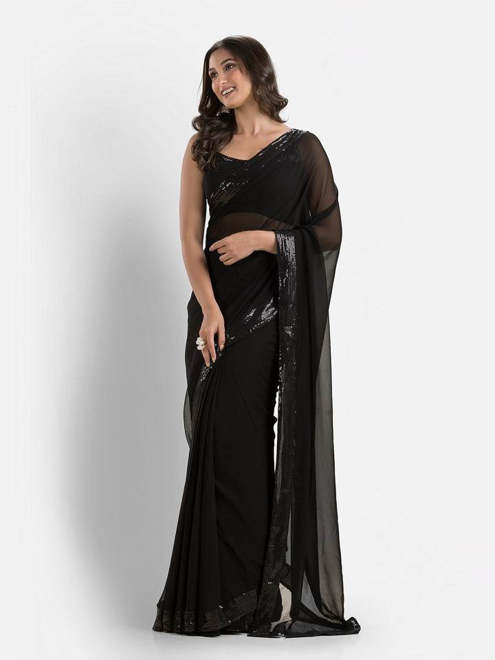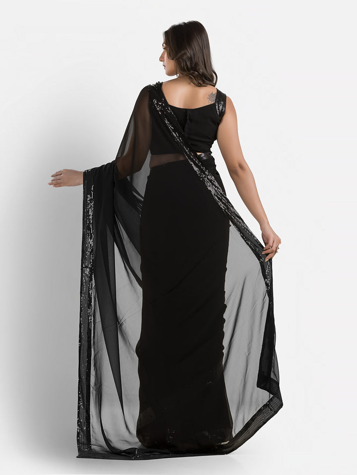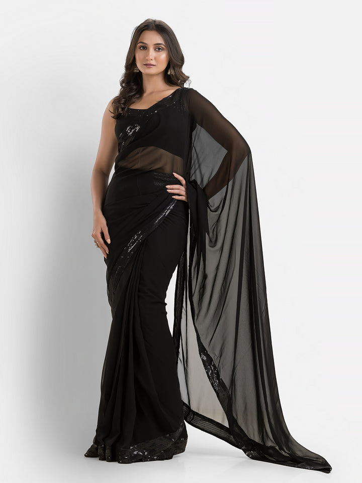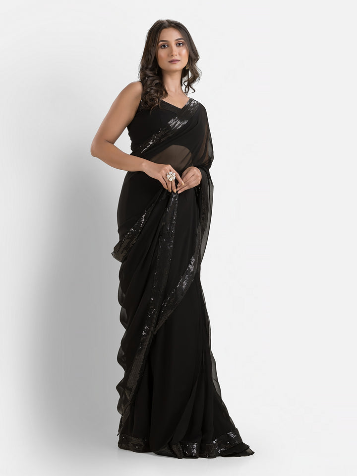 Galaxy Black Pre-draped Saree with Blouse & Petticoat – Indievastra