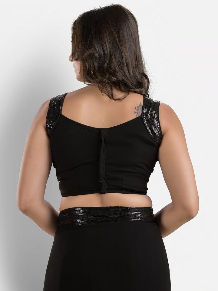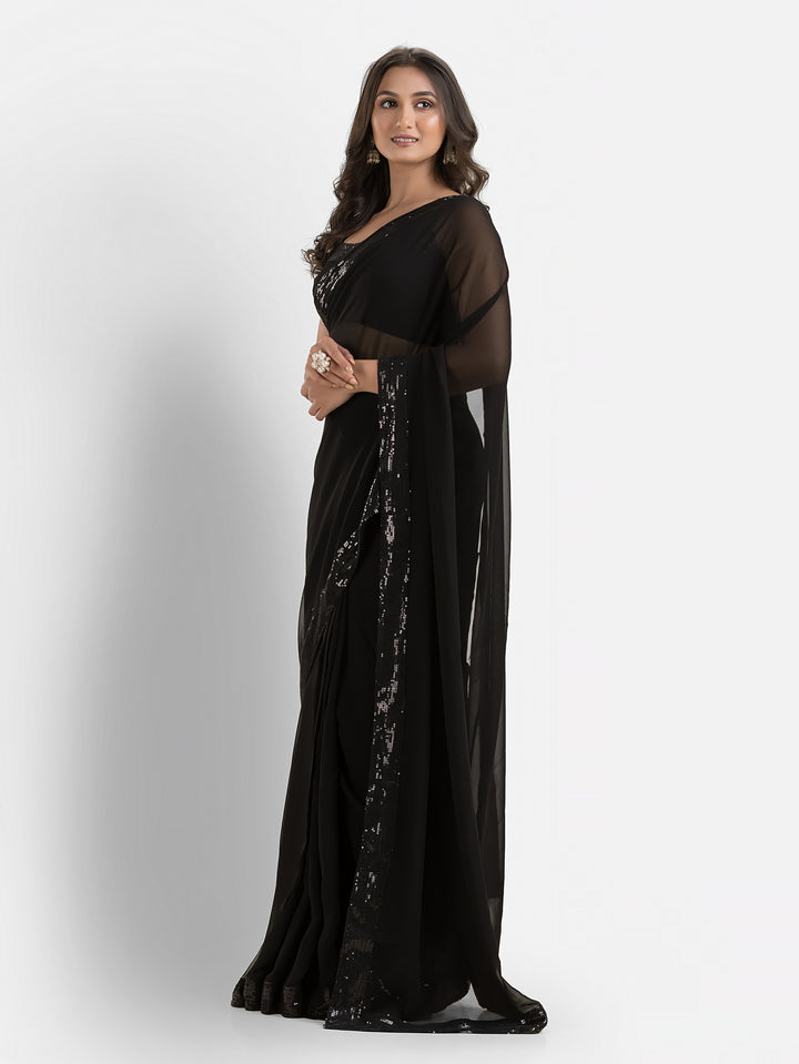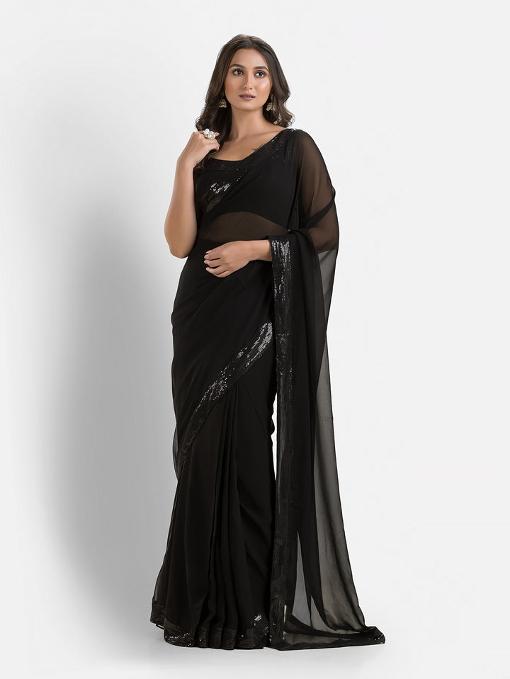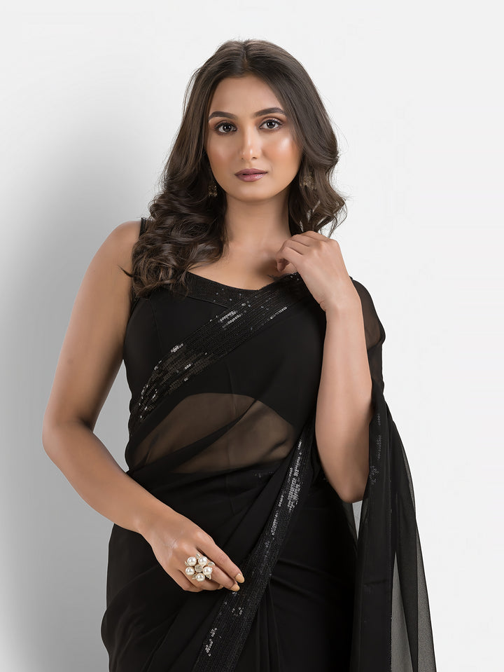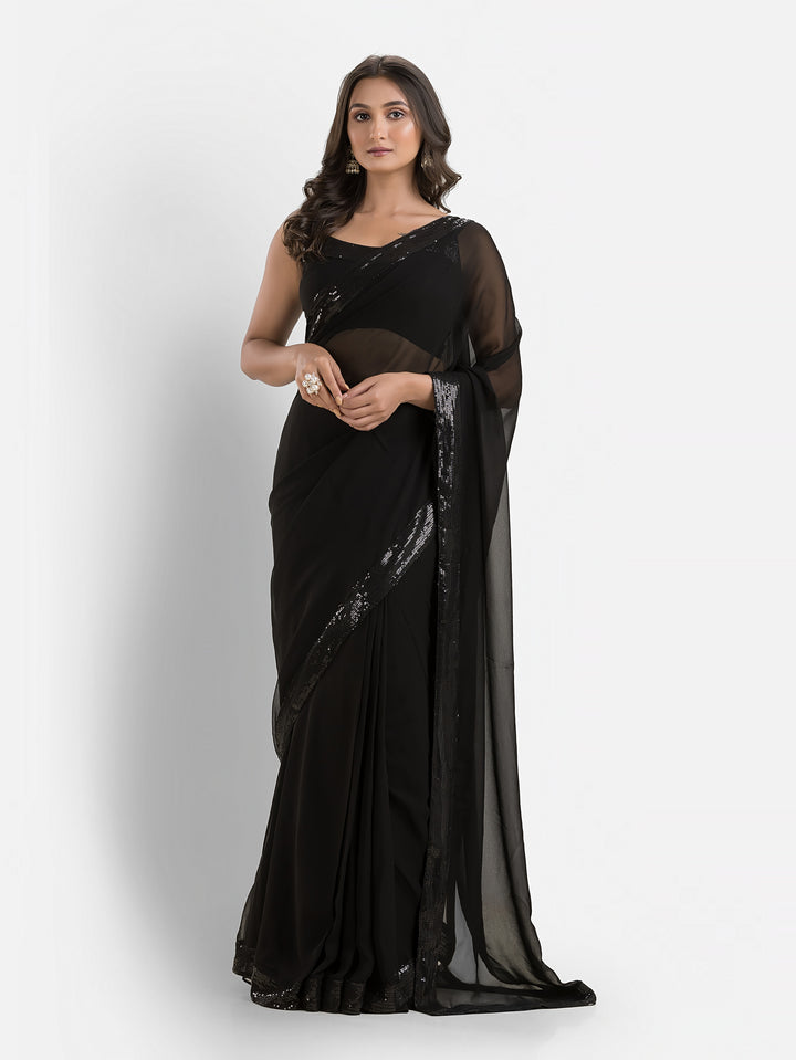 Galaxy Black Pre-draped Saree with Blouse & Petticoat – Indievastra